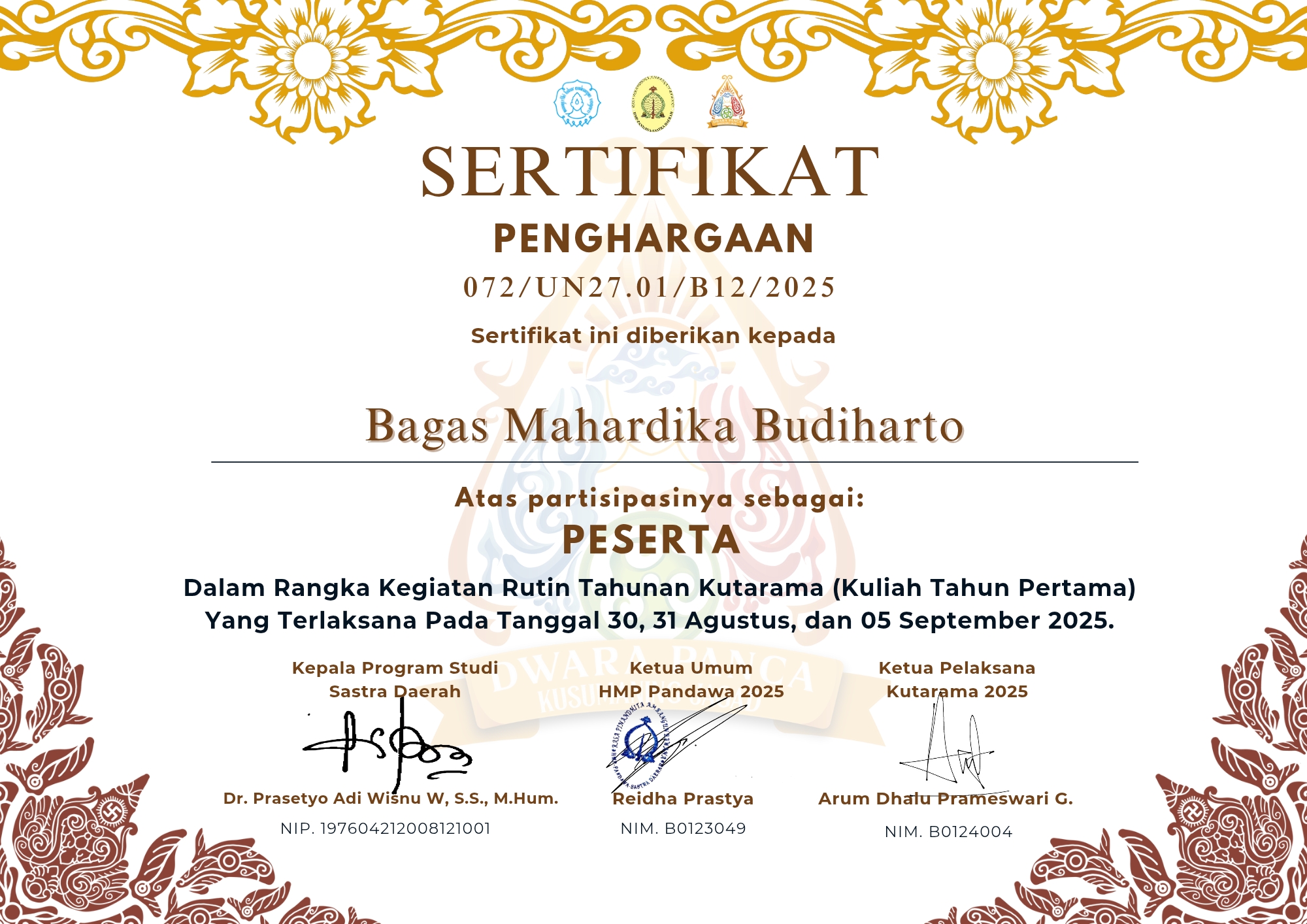 Saya mendapatkan sertifikat ini karena telah menyelesaikan Kutarama (Kuliah Tahun Pertama) di Sastra Daerah 2025.